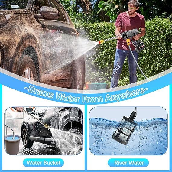 Conectando el filtro, se pueden filtrar piedras, grava, arena, barro y otras impurezas para proteger mejor la pintura del coche, y se puede extraer agua de las siguientes fuentes: ríos, cubos, tanques y mangueras de jardín se pueden realizar. (Nota: El agua de mar está prohibida para evitar la corrosión de la estructura interna del producto. La caída no debe ser superior a 1,5m, de lo contrario el rendimiento del bombeo se verá afectado.)